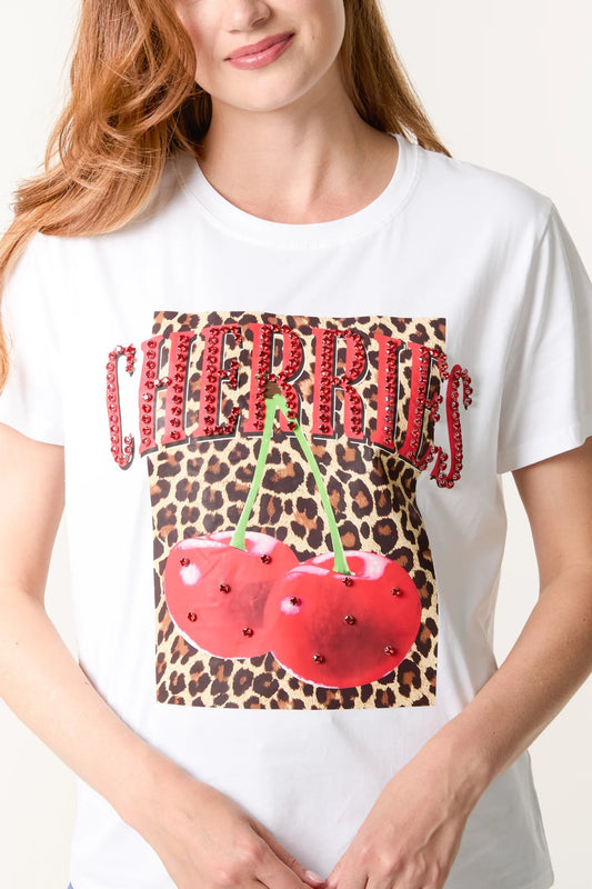 CHERRIES - Chunky Diamante Cherry & Leopard T-Shirt - 2 Colours - 2 Sizes