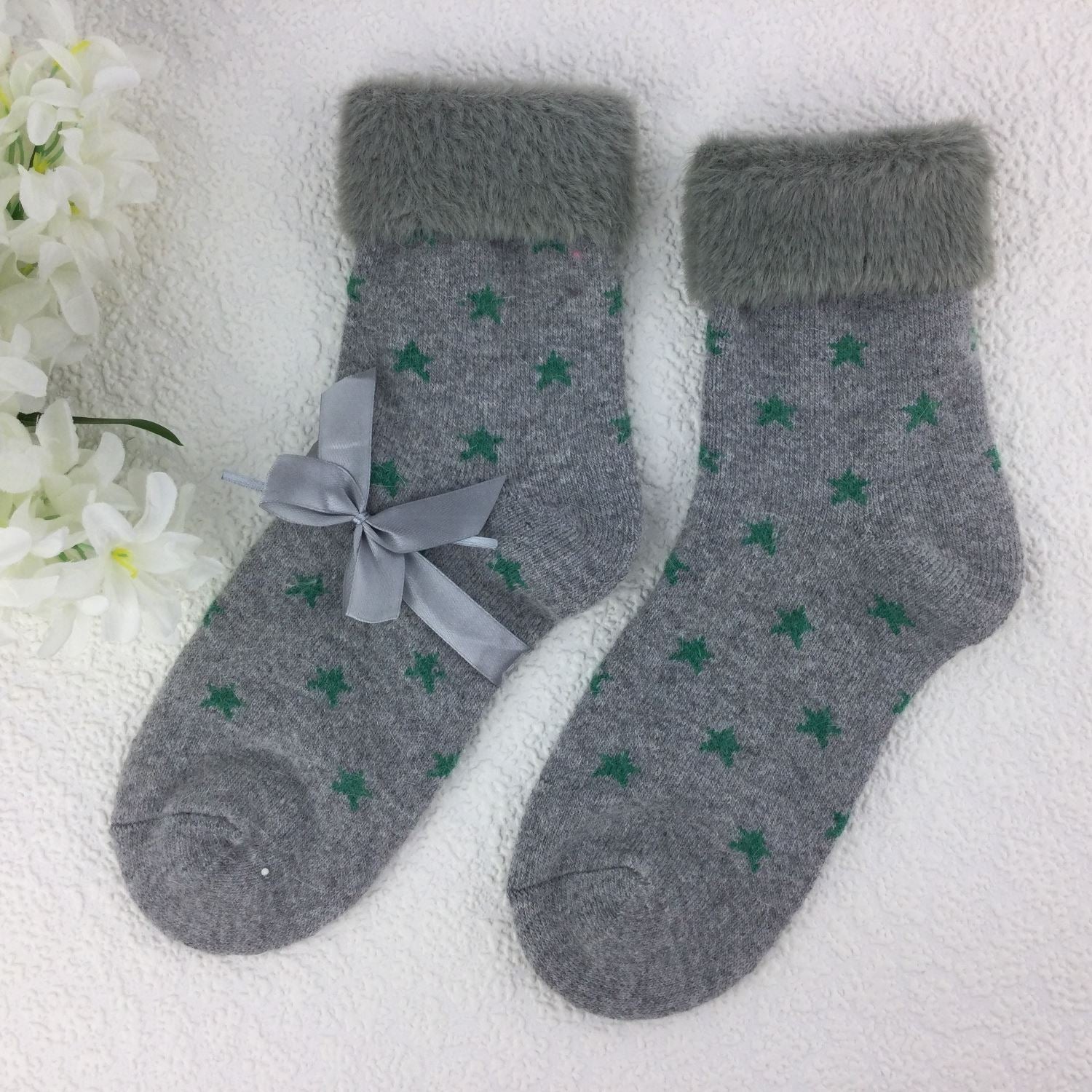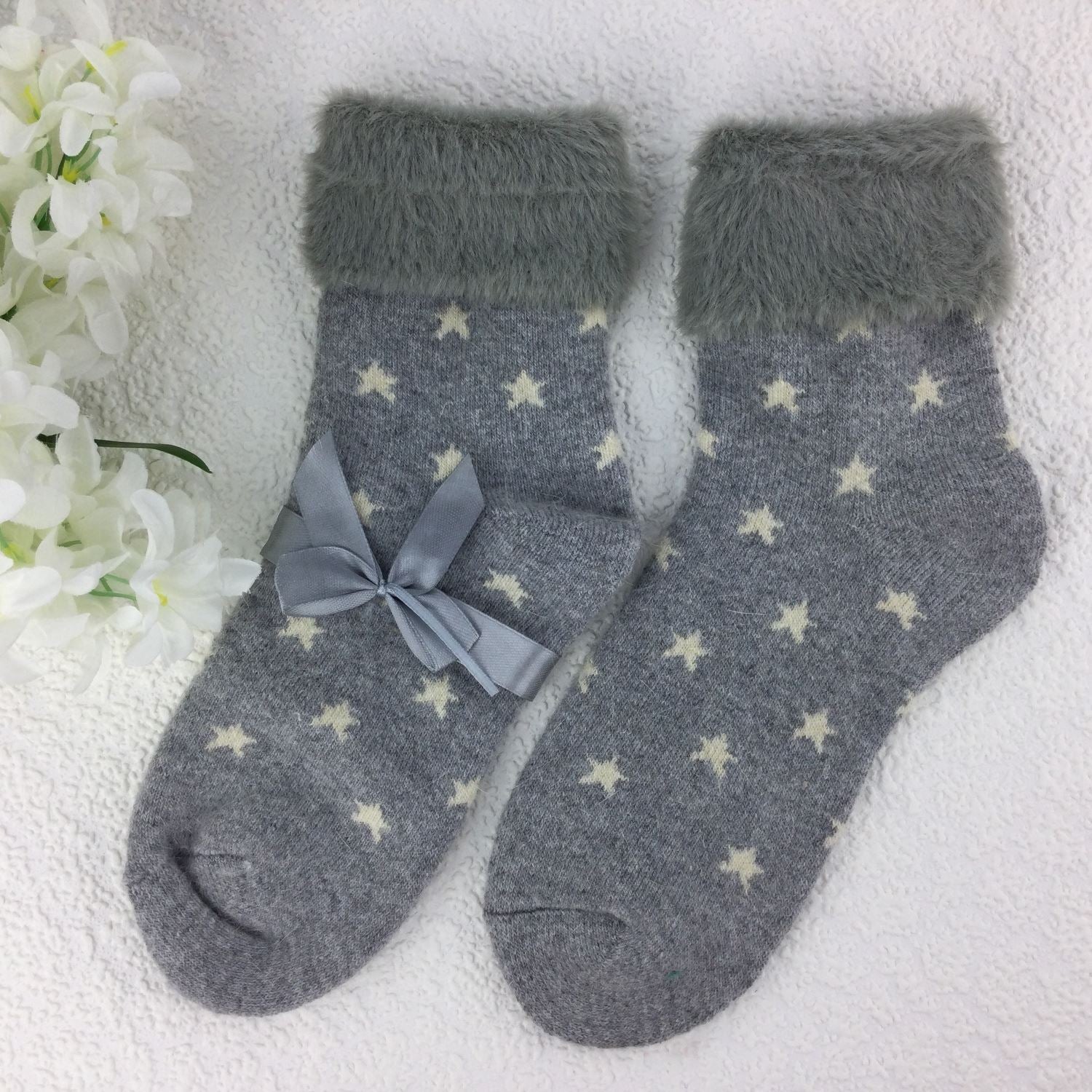 SOCKS - Wool Blend - Star Pattern - Faux Fur Trim - One Size - Various Colours