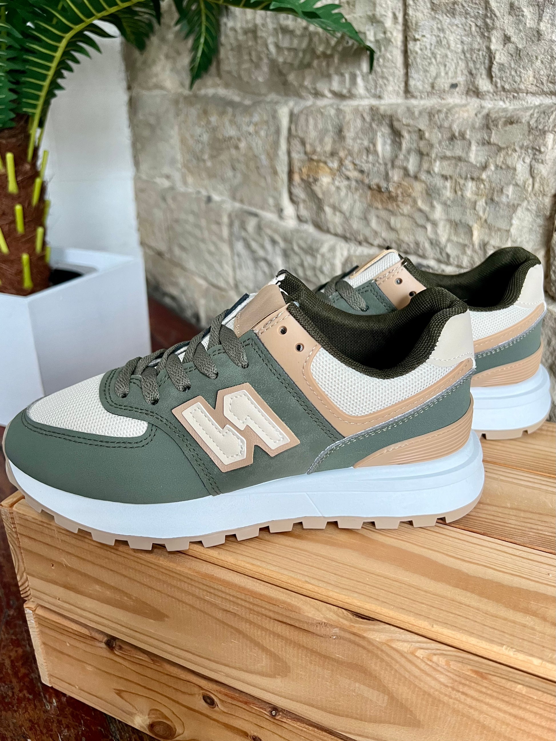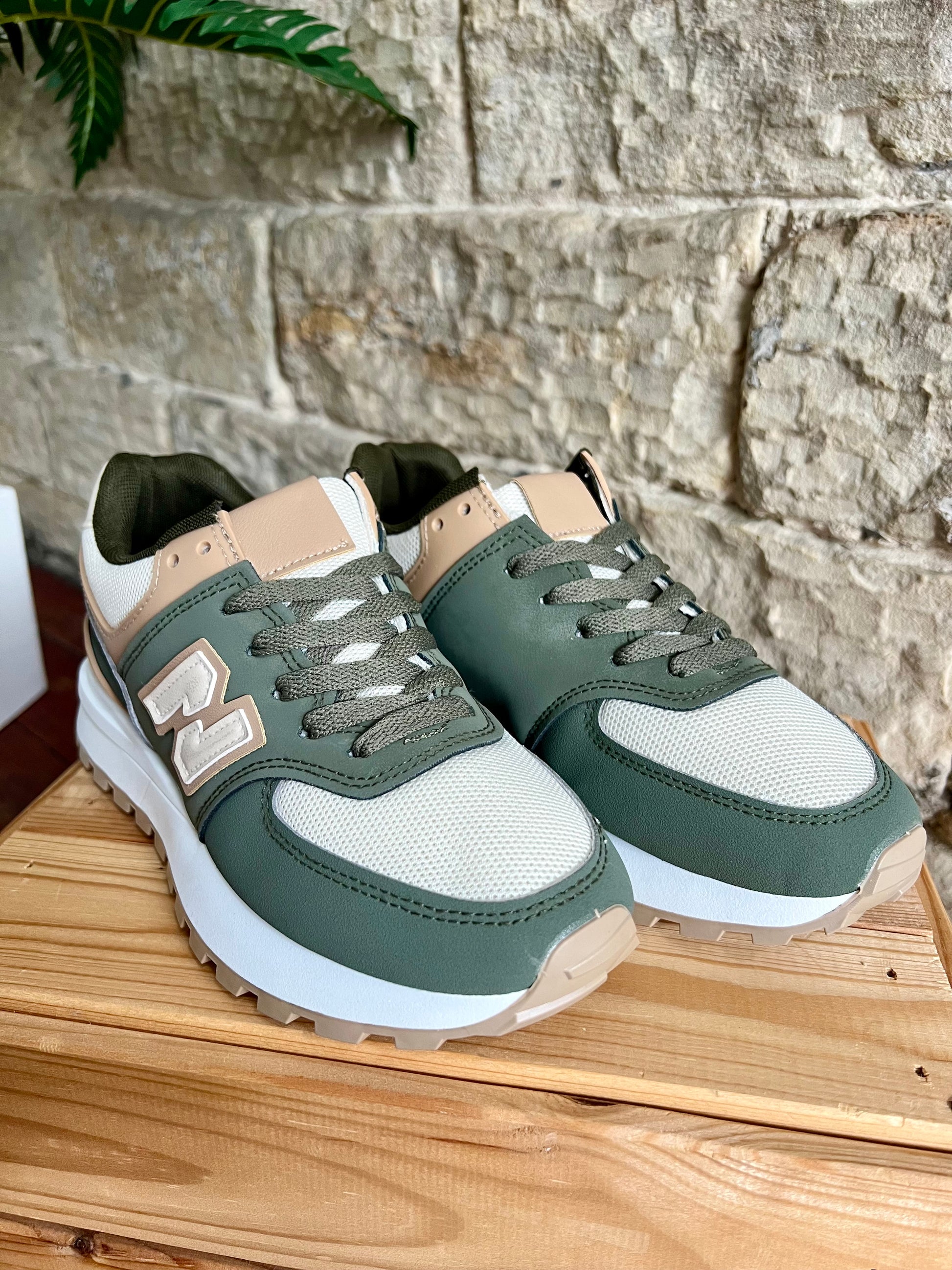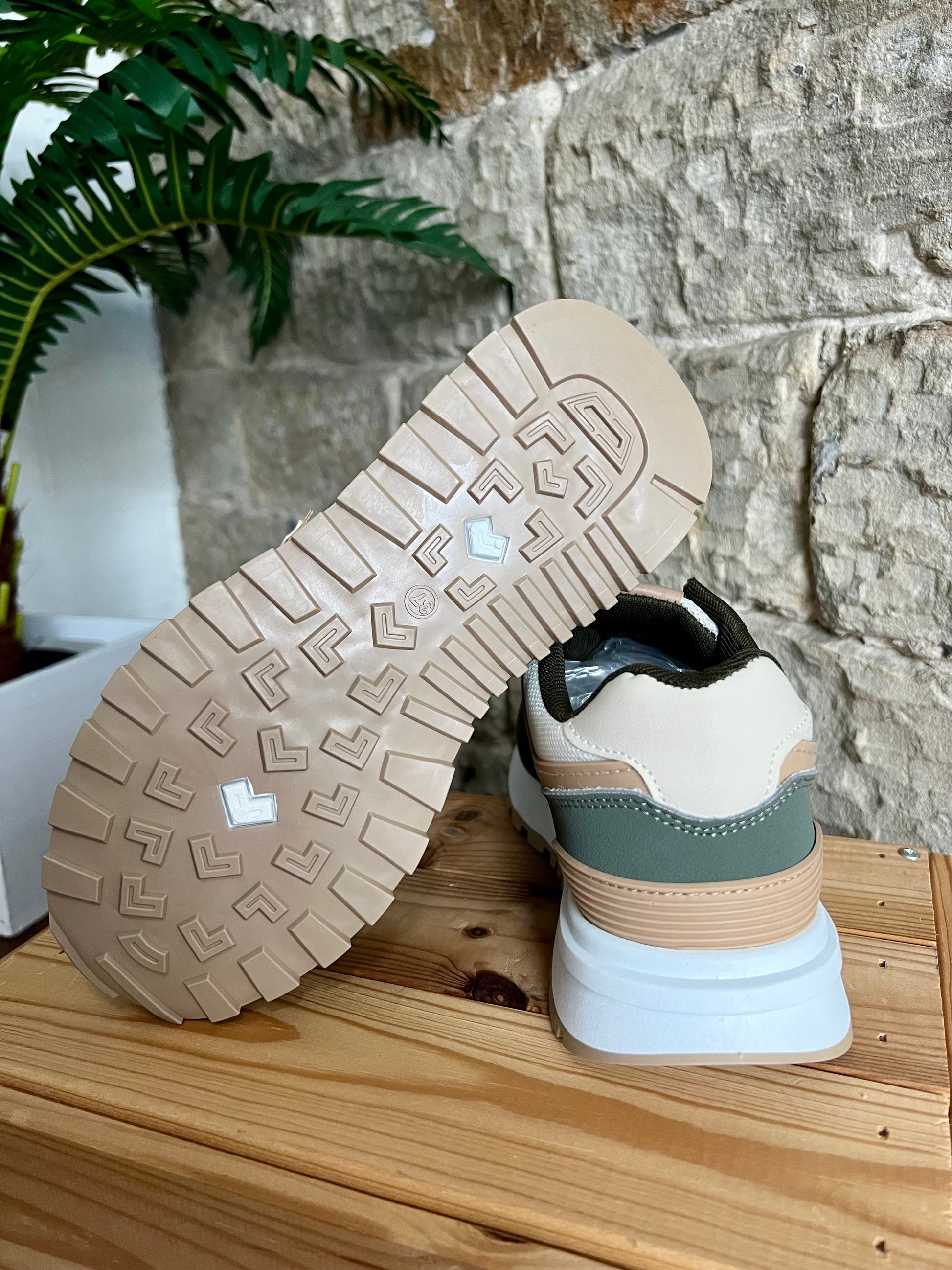 TONI - Two Tone Running Style Trainers - Khaki Green & Beige - Sizes 3-8